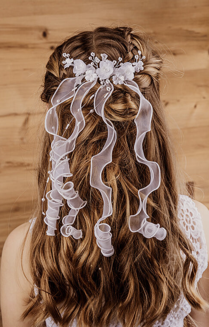 Add the perfect finishing touches to your little one’s Holy Communion dress. Browse our collection of veils, tiaras/headpieces, shoes, tights, handbags, gloves, cardigans/boleros, and jewellery.
